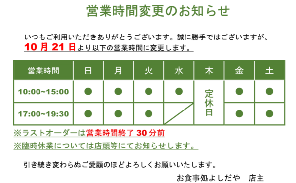 いつも当店をご利用いただきありがとうございます。 2025年10月21日より以下の営業時間で営業しておりますので、あらためてお知らせいたします。 ご確認のほどよろしくお願いいたします。 【日・月・火・金・土】 10:00 […]